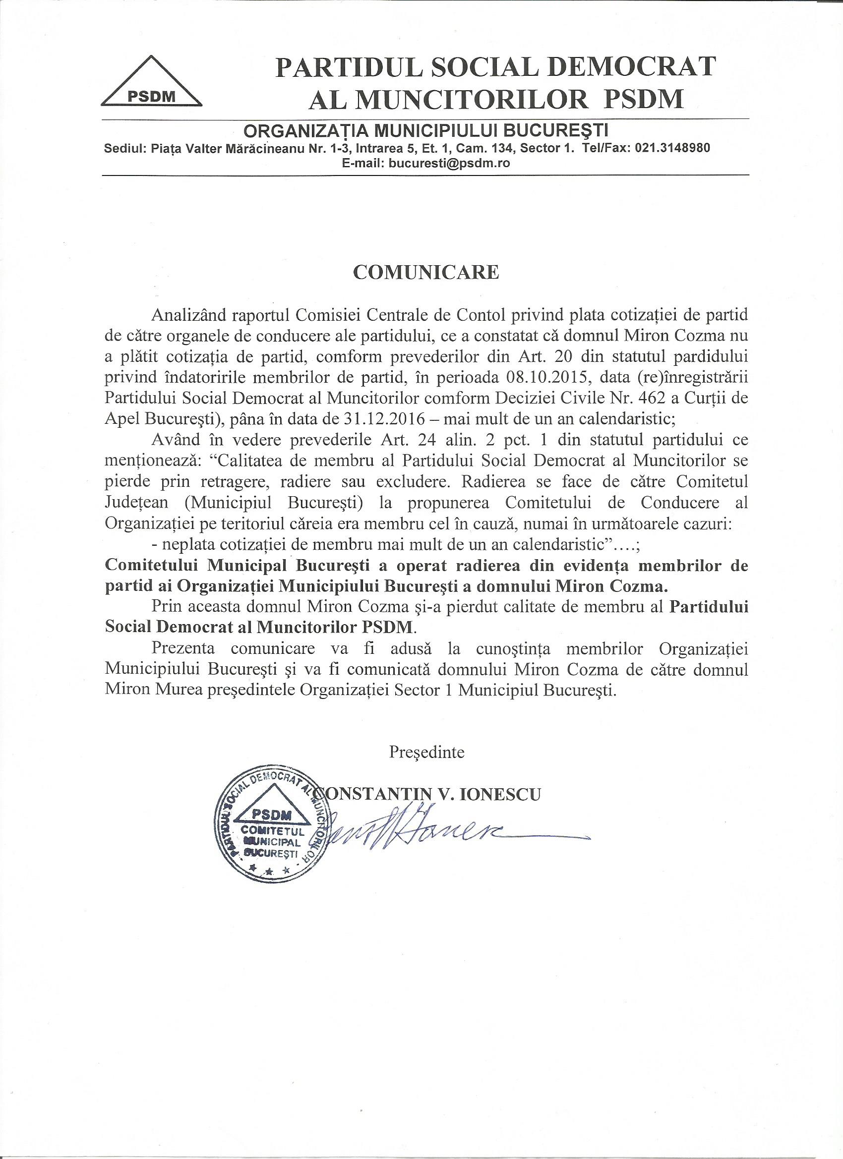 Avand in vedere prevederile Art. 24 alin. 2 pct. 1 din statutul partidului, Comitetul Municipal Bucuresti a operat radierea din evidenta membrilor de partid ai Organizatiei Municipiului Bucuresti a domnului Miron Cozma pentru neplata cotizatiei de membru pentru mai mult de un an calendaristic.