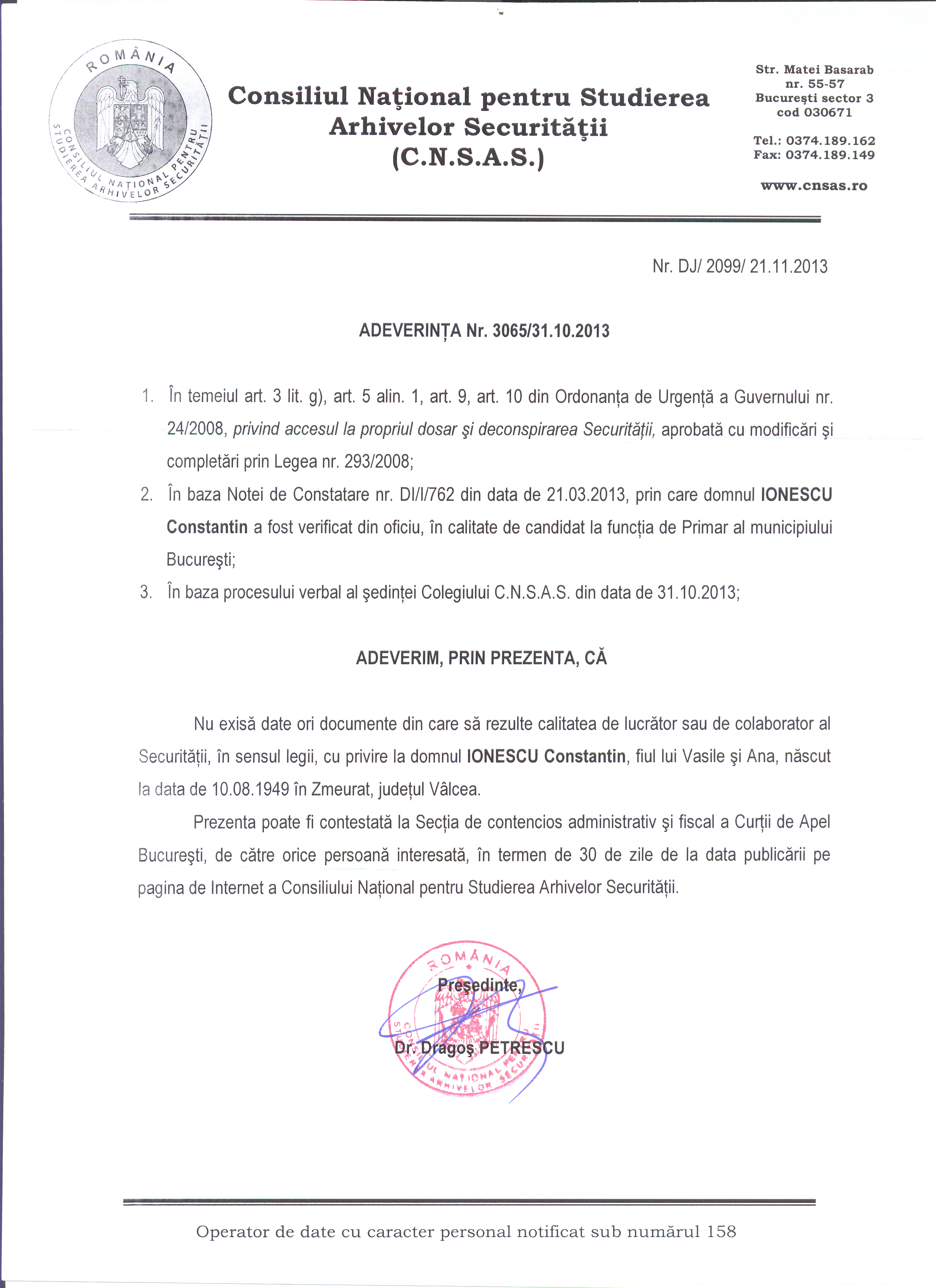 Nu am fost membru PCR şi nu am fost membru sau colaborator al vreunui serviciu de informaţii român sau străin.